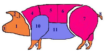 Собираясь в магазин за покупкой свинины, определите, что вы собираетесь с ней сделать и как приготовить. У каждой свиной части есть свои особенности со своими достоинствами и недостатками. Ниже представлена информация (рисунок и таблица), которая поможет разобраться в этом вопросе.
