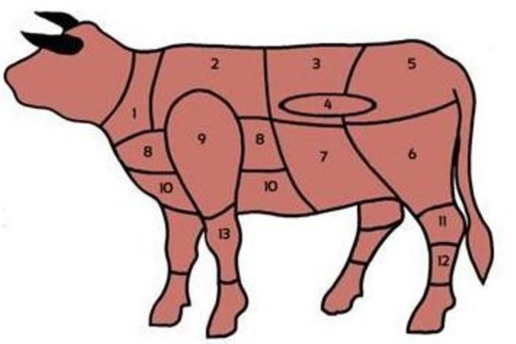 Непосредственно перед покупкой покупатель должен не только проверить качество мяса, но и правильно выбрать и определить часть говяжьей туши, ее предназначение. Представленные ниже рисунок и таблица помогут покупателю в этом разобраться.